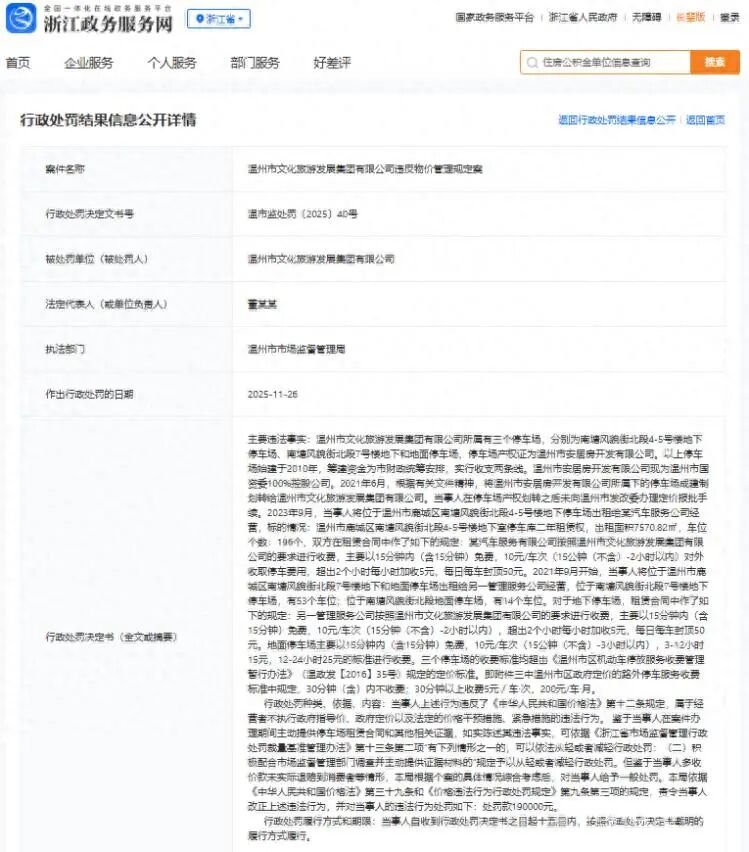 温州市文旅集团违规收取停车费,被罚款19万元